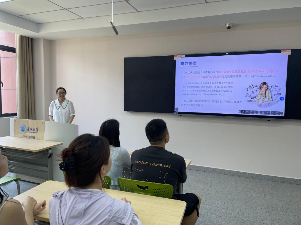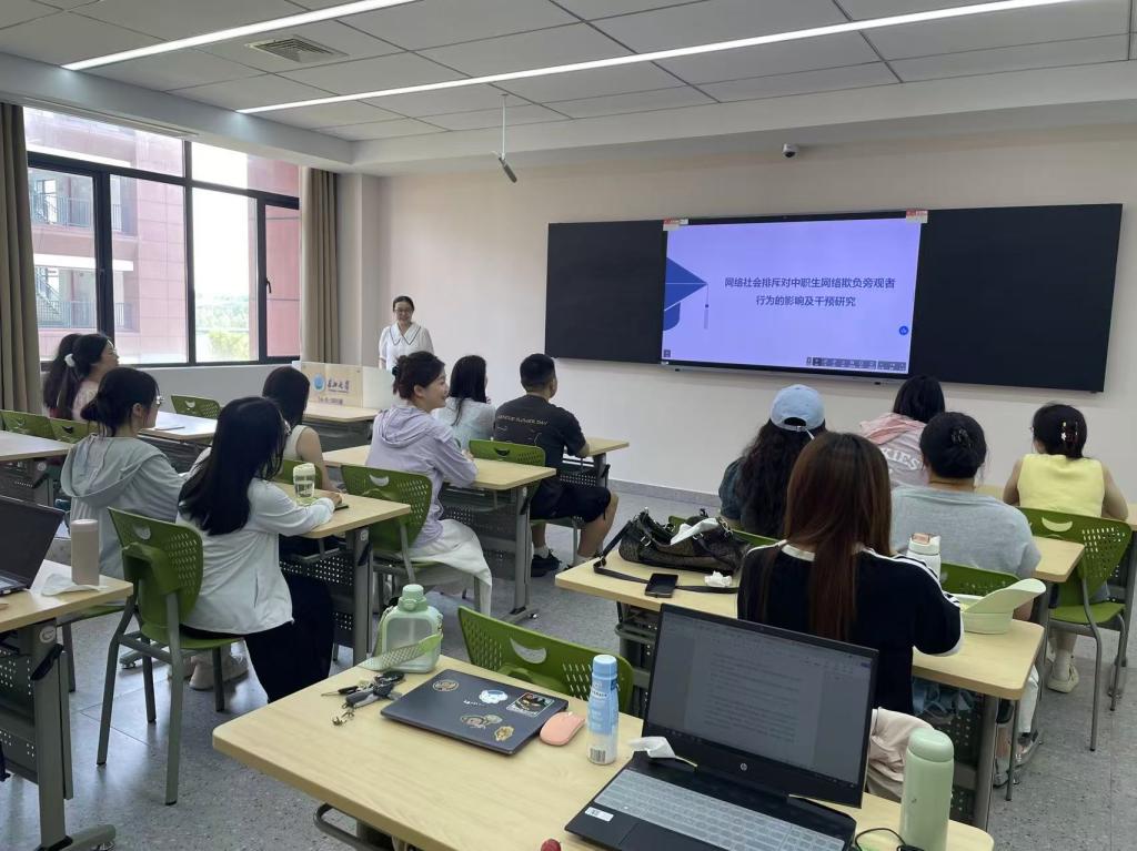 会上,周婷老师以网络欺负为话题,从网络欺负对青少年的情绪、行为等方面的影响入手提出研究问题,并从三个大研究七个子研究,介绍了网络社会排斥影响中职生网络欺负旁观者行为的心理机制的即时效应和长时效应,在此基础上,进一步介绍了短时自悯写作干预以及系统的自悯训练团体辅导干预在缓解网络社会排斥对中职生网络欺负旁观者行为的消极影响中的干预效果。该研究为有效预防和干预网络欺负事件的发生发展提供了借鉴和参考。