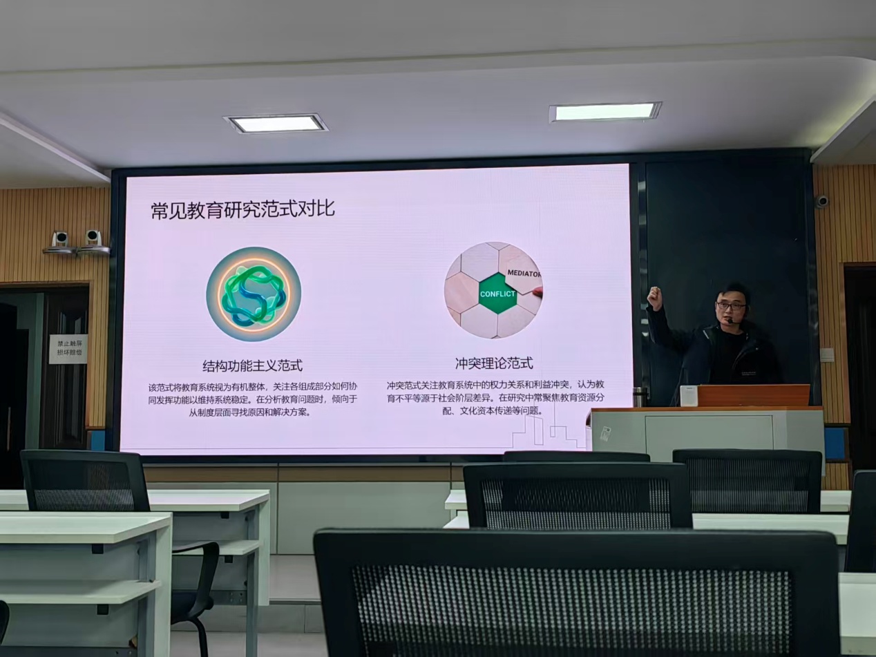 在论文写作基本原则部分,薛振伟老师强调需遵循事实证明、理性理由、学术规范与创新价值四大原则,指出知识产出要基于事实佐证,研究过程需恪守学术诚信,同时要凸显研究的理论或方法创新价值。此外,他还讲解了分析范式的选择与应用,介绍实证主义、解释主义、批判主义等常见教育研究范式,对比结构功能主义与冲突理论范式的核心视角,提醒研究者需明确范式立场、保持方法论一致性,必要时可采用混合方法研究。