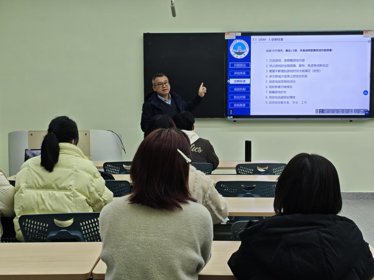 讲座中,陈方老师结合WHO ICD-11与DSM-5诊断标准,清晰界定了游戏障碍的四大核心指征,纠正了“以时长论成瘾”的常见认知偏差。从生物、心理、家庭、学校、社会及游戏设计六大维度,系统剖析了青少年游戏成瘾的形成机制,为后续干预研究筑牢理论根基。