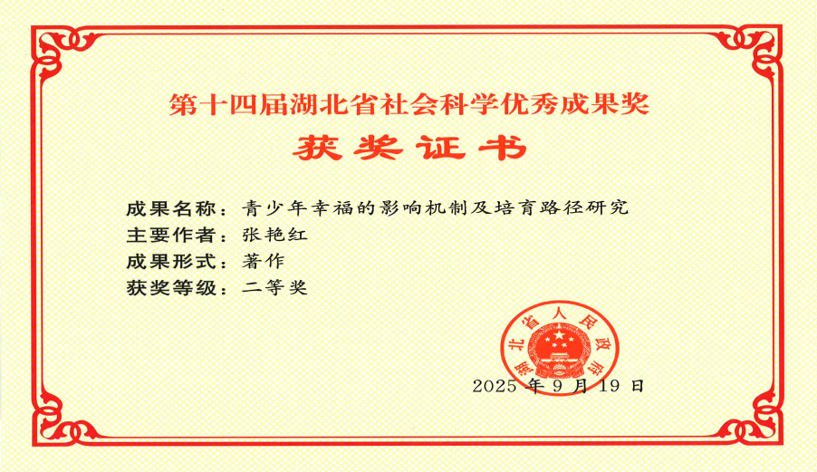 (通讯员 何巧楠)近日,湖北省社科成果奖证书颁发,球王会体育平台网页张艳红教授凭借专著《青少年幸福的影响机制及培育路径研究》,喜获第十四届湖北省社会科学优秀成果奖二等奖。这一荣誉既是对其深耕青少年心理健康领域的学术认可,也彰显学院社科应用研究紧扣时代需求、服务青少年成长的坚实实力,为学院科研工作历史性突破添彩。