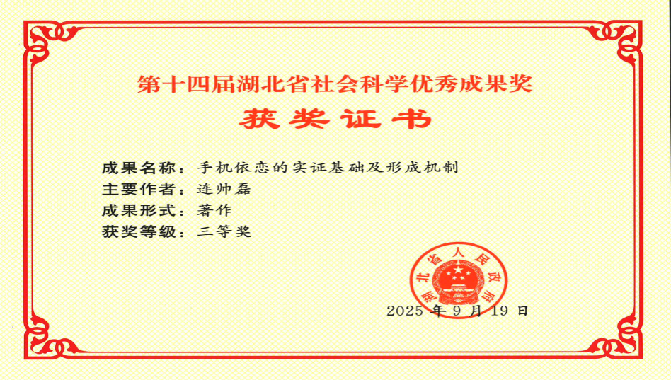 解码数字时代“手机依恋” 探索科学应对之道——连帅磊副教授著作获湖北省社科优秀成果三等奖