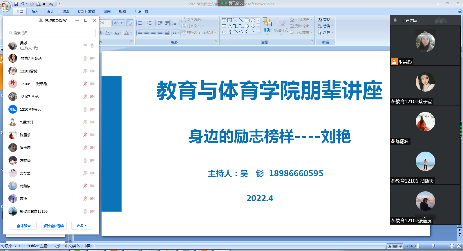 (通讯员 徐坤 李梦瑶)4月21日下午,球王会体育平台网页2022年球王会体育平台网页朋辈系列讲座第一讲《身边的励志榜样》顺利开讲。此次讲座由教育学院辅导员吴钐老师主持,体育系学生刘艳同学主讲,球王会体育平台网页全体2021级成员参加,借助腾讯会议线上平台进行。