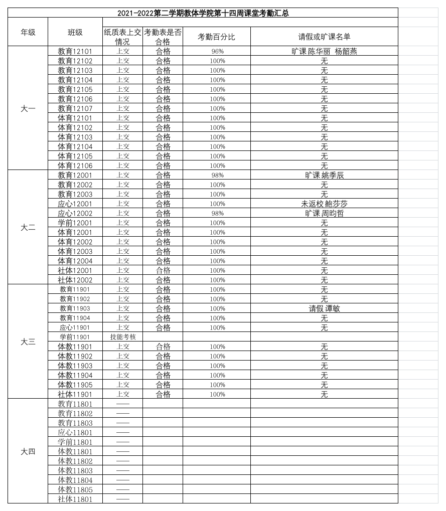 2021-2022年第二学期教体学院第十四周课堂考勤汇总