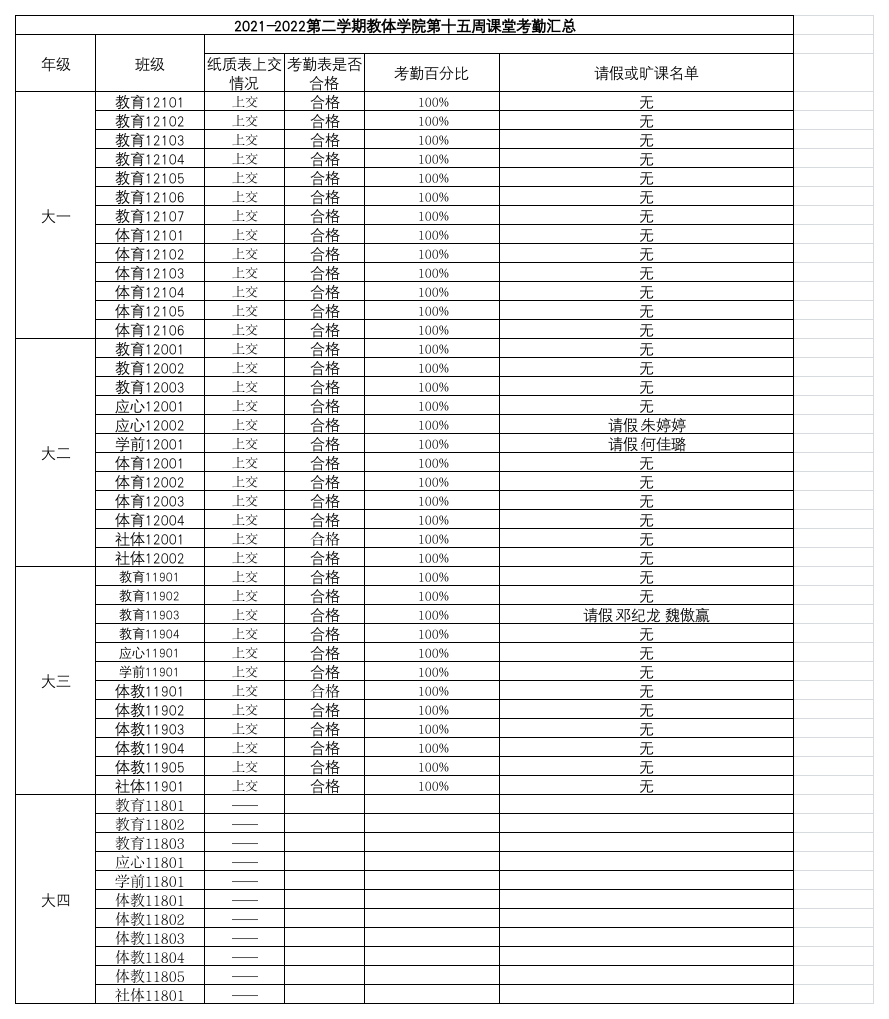 2021-2022年第二学期教体学院第十五周课堂考勤汇总