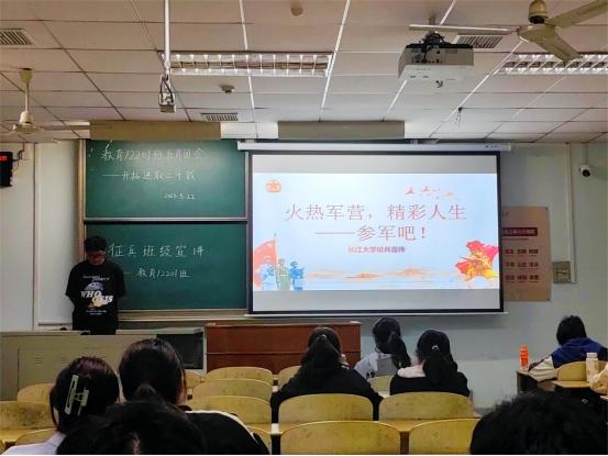 【通讯员 白薇 瞿廷婷】为鼓励学生积极参与应征入伍,5月22日至5月28日,球王会体育平台网页以班级为单位,利用班会、团会、晚自习陆续开展了征兵宣传活动,各辅导员、班主任及全体同学参会。