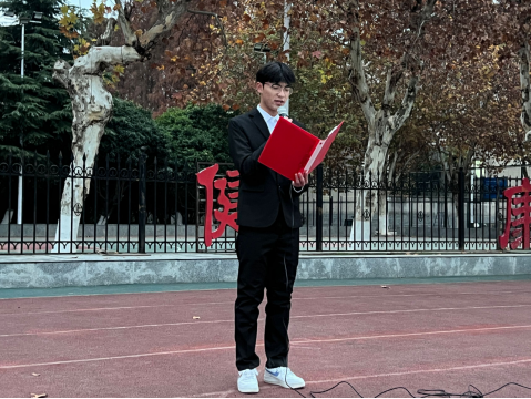 升旗仪式结束后,学生代表张尊威以“立报国之志,书奋斗青春”为主题进行了演讲,他回顾历史爱国志士事迹,阐述新时代抗疫、戍边、扶贫中的爱国精神,鼓励大学生应传承先辈遗志,化爱国精神为实际行动,为实现中华民族伟大复兴的中国梦添砖加瓦,为建设社会主义现代化强国而不懈奋斗。
