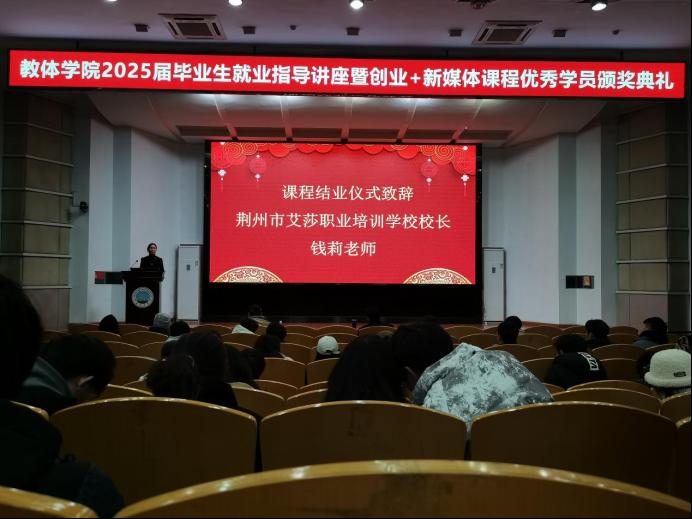随后,荆州市艾莎职业培训学校校长钱莉发表了结业仪式致辞。她对同学们在创业+直播课程中取得的优异成绩表示热烈祝贺,并分享了学校在职业教育方面的成功经验。钱校长希望同学们能够珍惜这次学习机会,将所学知识运用到实际工作中,为未来的职业发展奠定坚实基础。
