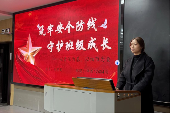 会议伊始,体教12402班班长马星莉作为学生代表发言。她结合自身在班级管理中的实际经验,围绕班级安全管理和寝室安全监督两大核心方向,系统而具体地介绍了日常工作中采取的有效措施和应对策略。她着重分享了如何通过定期班会强化安全意识,建立寝室长责任制以加强日常监督及在处理突发情况时的实际操作经验。这些详实而具有代表性的做法,为在座的各班学生干部提供了可借鉴、可推广的安全工作经验参考,增强了大家开展相关工作的信心与能力。