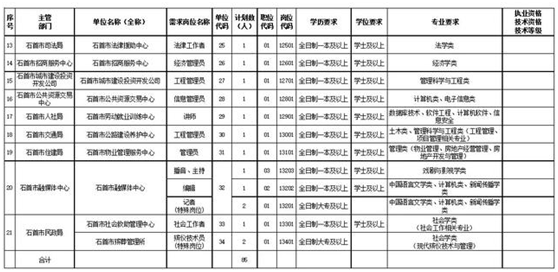 全市计划引进85名紧缺专业博士研究生、硕士研究生、本科生、特殊岗位人才(具体岗位计划详见附件3)。重点引进教育、卫生、机械、工程、测绘、化学、农业、金融、经济、文学、法学、财会、计算机等行业相关专业的人才。