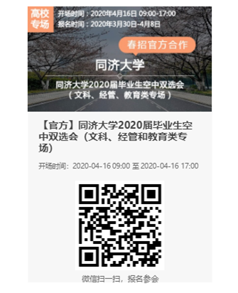 当前,新冠肺炎的疫情防控工作正处在关键时期,根据党中央、国务院决策和教育部、上海市工作部署,我校春季学生就业工作已经做出相关调整,暂停各类线下校园招聘活动。为保证2020届毕业生就业工作不断线,促进毕业生更充分和、更高质量就业,搭建用人单位和毕业生双向选择平台,兹定于2020年4月举办同济大学2020届毕业生春季空中双选会(文科、经管、教育类专场)。