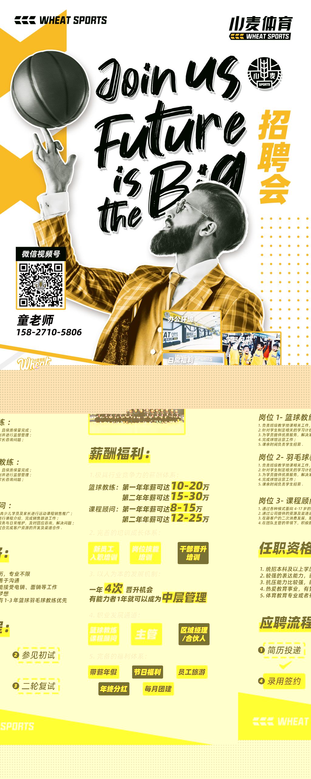 小麦体育-篮球 羽毛球 跳绳 教练/助教岗(20人) 小麦体育-辅导老师岗(15人): (武汉江汉路)(有住房+最高课时费+有食堂+导师辅导): 1.教学对象:4-18岁的少年儿童。 2.教学内容根据公司统一的教学方案对学员进行基础球类个人技术、技战术演练、专业体能训练等。 3.招生: 4-18岁对篮球羽毛球跳绳感兴趣学员。 岗位要求: 1.有较强的教学实践能力,有较强的语言沟通能力,富有亲和力; 2.为人诚恳,工作态度积极,踏实肯干; 3.体育院校毕业,专业队教练,退役队员或具备其他相关技能和条件者优先录用。 岗位待遇(1-3万):1. 高底薪4000(无责3600) +绩效提成(7%-21%)+岗位提成(1%+2%)+课时费(90元/课时-230元/课时) 2.球馆优势,16家自营馆,遍布武汉三镇。球馆位置集中在内环,循礼门,香港路,永旺,汉口城市广场,武汉天地等商圈位置。3. 晋升路径:运动教练(P1-P6)---储备主管(P3)---团队主管---区域经理---城市负责人;无限的发展和公平透明的晋升空间;4. 系统化培训:定期岗前技巧技能培训!不同阶段对应的专题培训,不定期的技能培训,完善的成长机制。5. 超高福利:周、月、季度奖金年终奖节日福利月度团建(聚餐、球赛……)季度旅游。6.工作时间:9:30-18:30(弹性工作,自愿加班) 地址:武汉市江汉区单洞路特1号武汉国际大厦B栋21楼 联系方式:童15827105806(同微信)