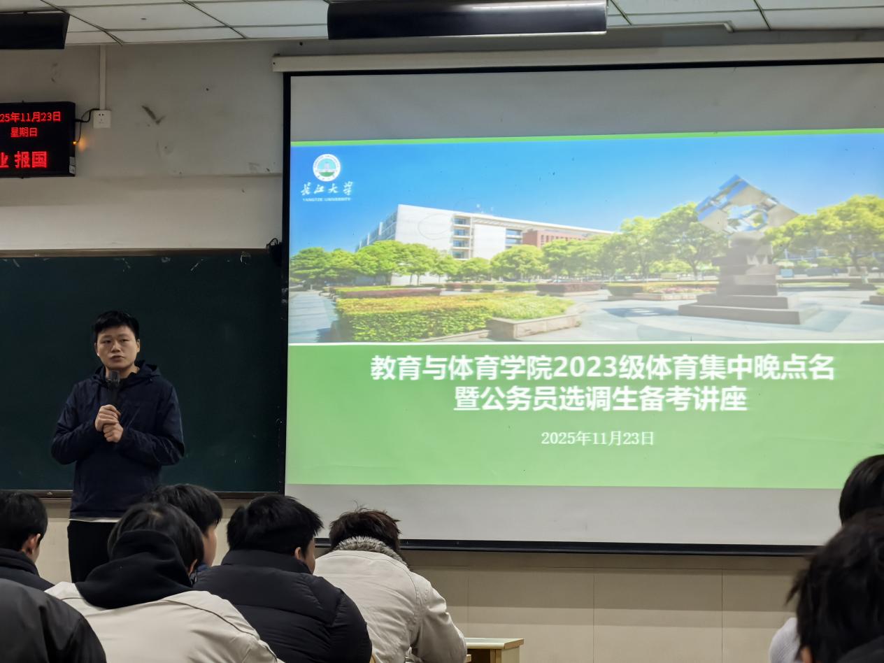 (通讯员 刘濠淙)为扎实推进年级管理工作,助力体育专业学子明确就业方向、科学备战公务员考试,2025年11月23日,球王会体育,球王会体育平台网页2023级体育集中晚点名暨公务员选调生备考讲座在12教102教室顺利举行。本次活动兼顾日常管理与就业指导,为同学们搭建了精准化的成长服务平台。