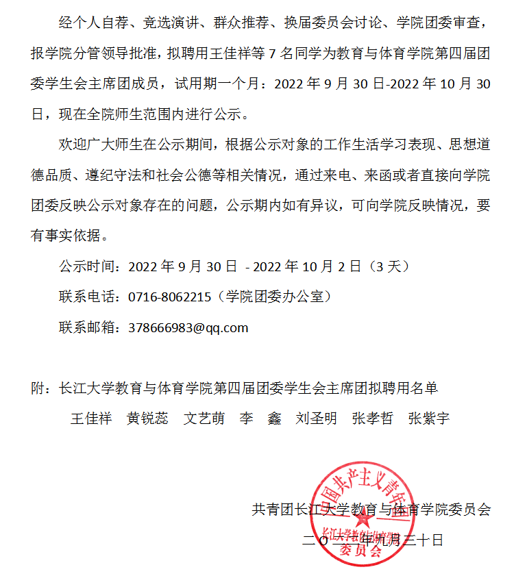 关于球王会体育,球王会体育平台网页第四届团委学生会主席团成员拟录用名单的公示