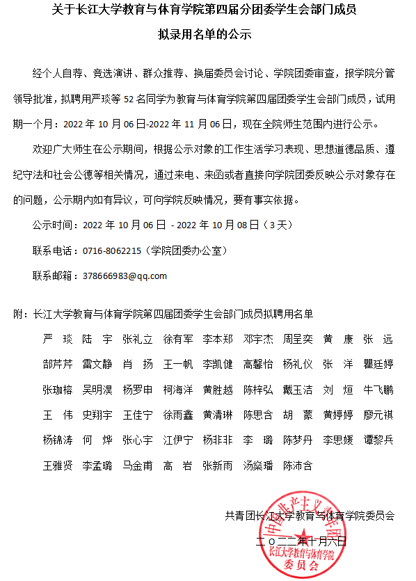 关于球王会体育,球王会体育平台网页第四届团委学生会部门负责人拟聘用名单的公示