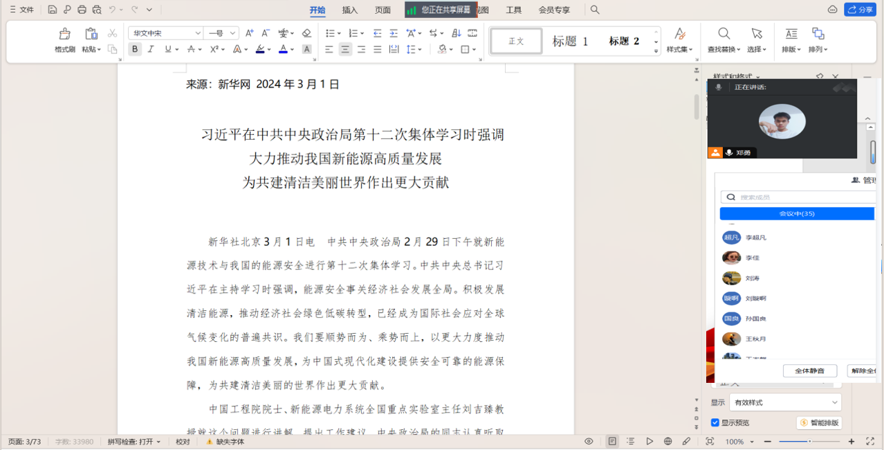 第一部分主要学习了习近平总书记重要讲话和重要批示指示。首先,习近平在中共中央政治局第十二次集体学习时强调大力推动我国新能源高质量发展为共建清洁美丽世界作出更大贡献;其次,习近平在2024年春季学期中央党校(国家行政学院)中青年干部培训班开班之际作出重要指示,强调牢记初心使命,拼搏进取,奋力跑好历史的接力棒,蔡奇出席开班式并讲话;最后,为推进中国式现代化注入强大动力——习近平总书记同出席2024年全国两会人大代表、政协委员共商国是纪实。