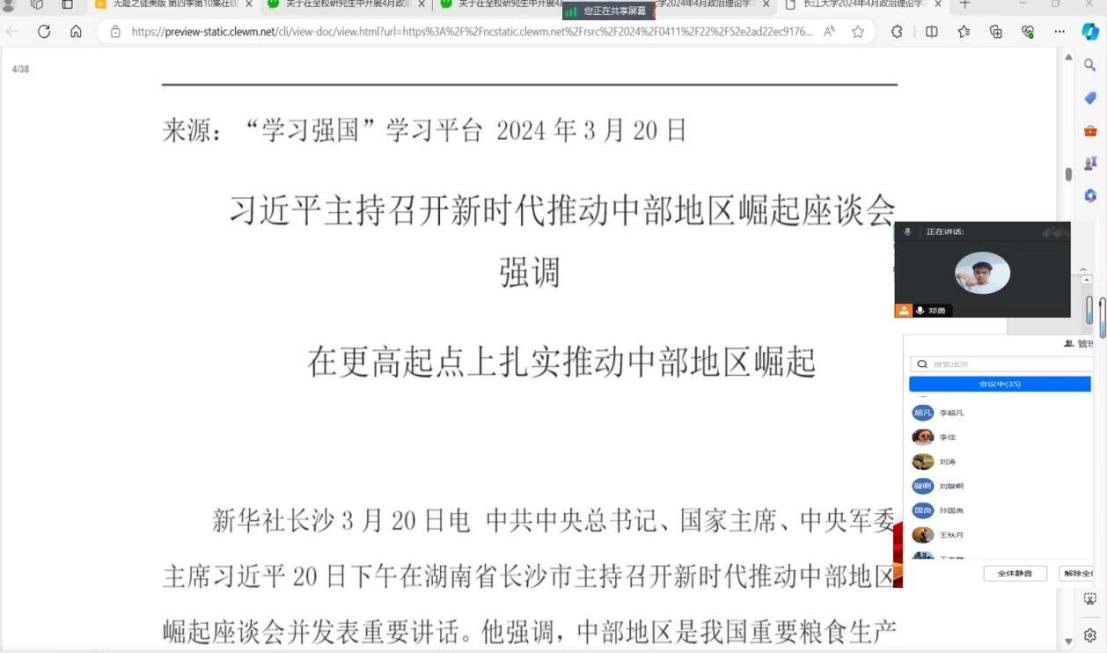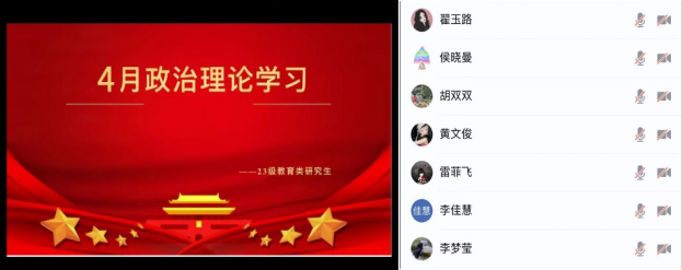 【通讯员 倪梓曦】2024年4月11日至29日,球王会体育平台网页全体研究生开展了四月份政治理论学习。各班采用了线上与线下、集体学习与个人自主学习相结合的方式,由团支书进行组织,辅导员陈佳琳老师参与、督促学习。