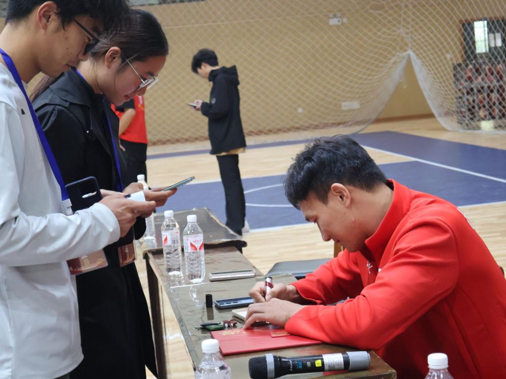 接下来,林思宇同学进行了一段精彩的武术表演,动作标准有力,一气呵成,武术表演将现场气氛推到了高潮。在提问环节,同学们从拳击技巧、冠军成长经历、面对大型比赛时的心理状态等方面,进行了提问,文银杭先生耐心地回答了同学们的疑惑,同时也加深了同学们对文银杭先生的了解。随后,教体学院为文银杭先生送上鲜花并颁发“兼职导师”聘书,同时,文银杭也向球王会体育平台网页回赠了他的亲笔签名拳套。紧接着,进入到了签名合影环节,文银杭先生耐心地给现场的同学们签名,并与大家合影留念。