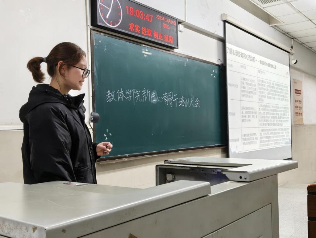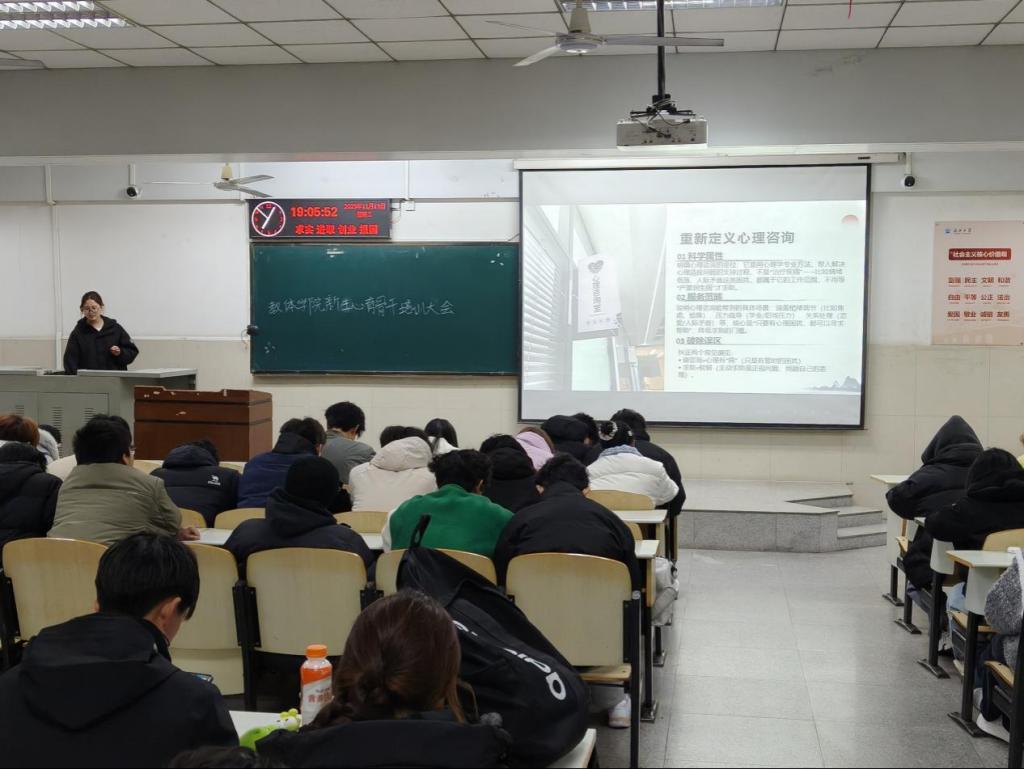 【通讯员 唐鑫 焦铄童 耿诗涵 曾雪晨等/摄 谷世家 王子润/文】为帮助球王会体育平台网页2025级新生骨干提升心理自助与助人能力,更好地发挥心育骨干在学生群体中的作用,11月19日晚19时许,2025年秋季新生心育骨干培训大会在12教104顺利举行。大会由辅导员任雯婷老师与学院心育部组织,大一和研一学生骨干参与,学院主持部徐紫涵同学主讲,与会人数近200人。