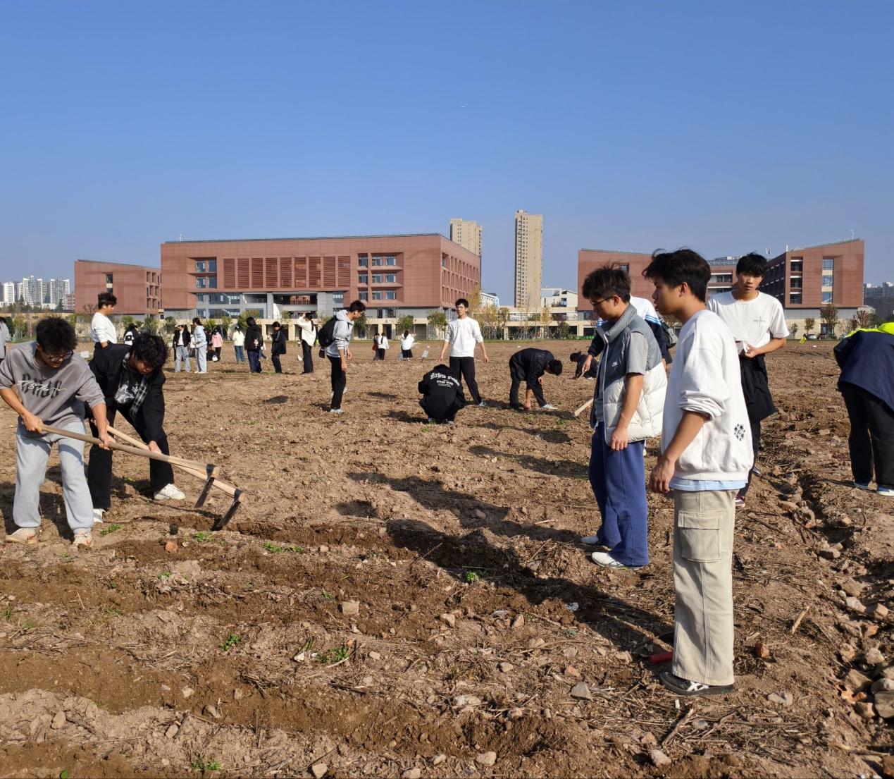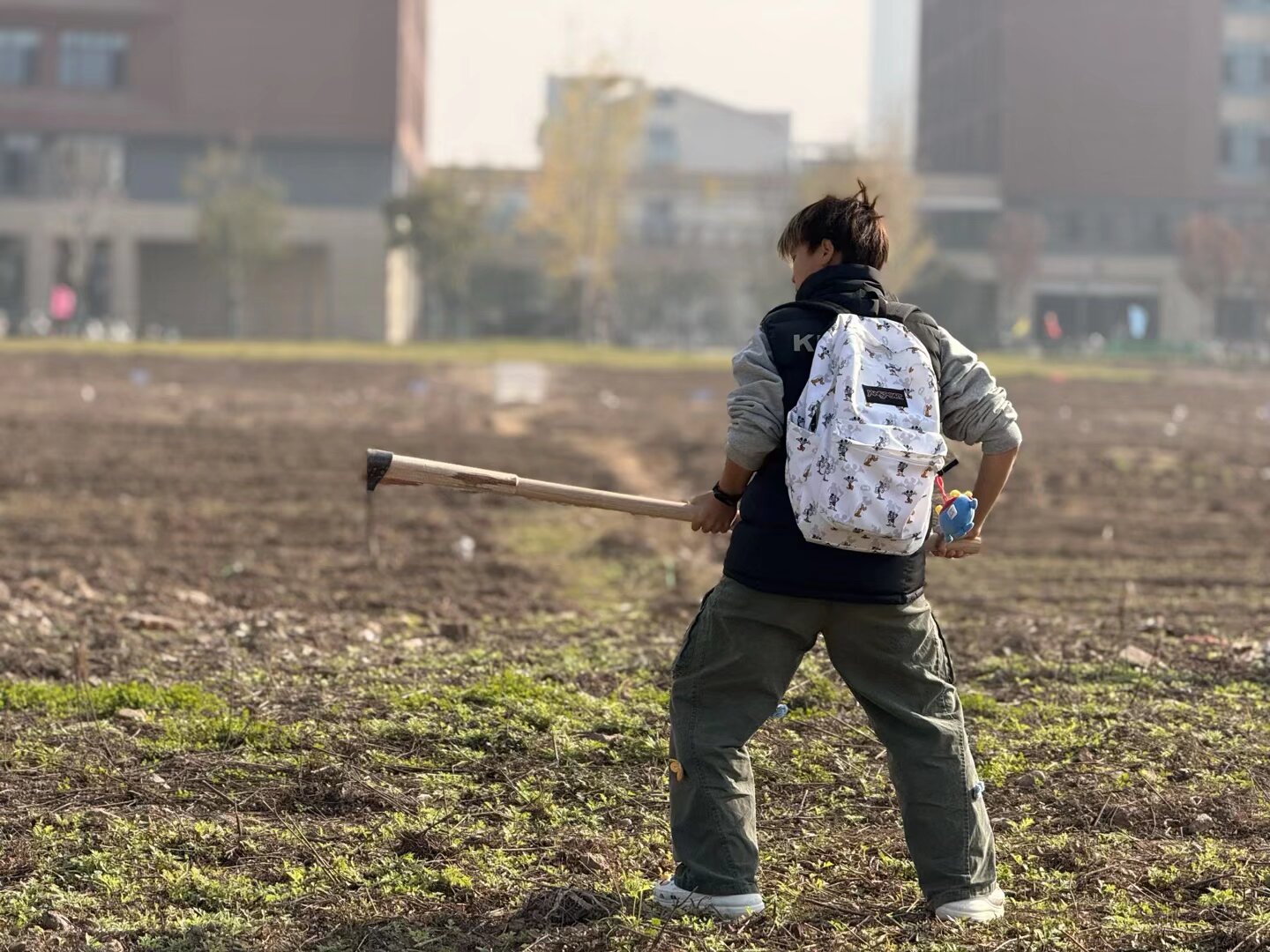 在活动中,新生们一边学习,一边实践,将理论知识与动手操作紧密结合。同学们在辅导员喻泽坤的带领下,学习并逐渐掌握了握锄沉肩、斜切入土、翻土碎块、播种浇水等动作技巧。尽管有些新生是第一次接触农具,动作略显生疏,但随着活动的进行,他们逐渐变得熟练。