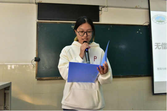 活动伊始,吴子轩介绍活动流程,明确本次活动包含献血知识宣讲、互动问答、总结讲话及合影留念四项核心环节,随后,邀请宣讲员王霄月同学开展知识分享。