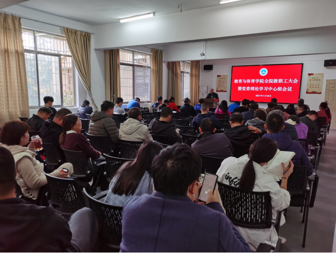 11月18日下午,教体学院在5教203召开11月份党委理论中心组学习暨全体教职工政治理论学习会。全体党委委员参与了本次学习,学习活动由分党委书记高明成主持。