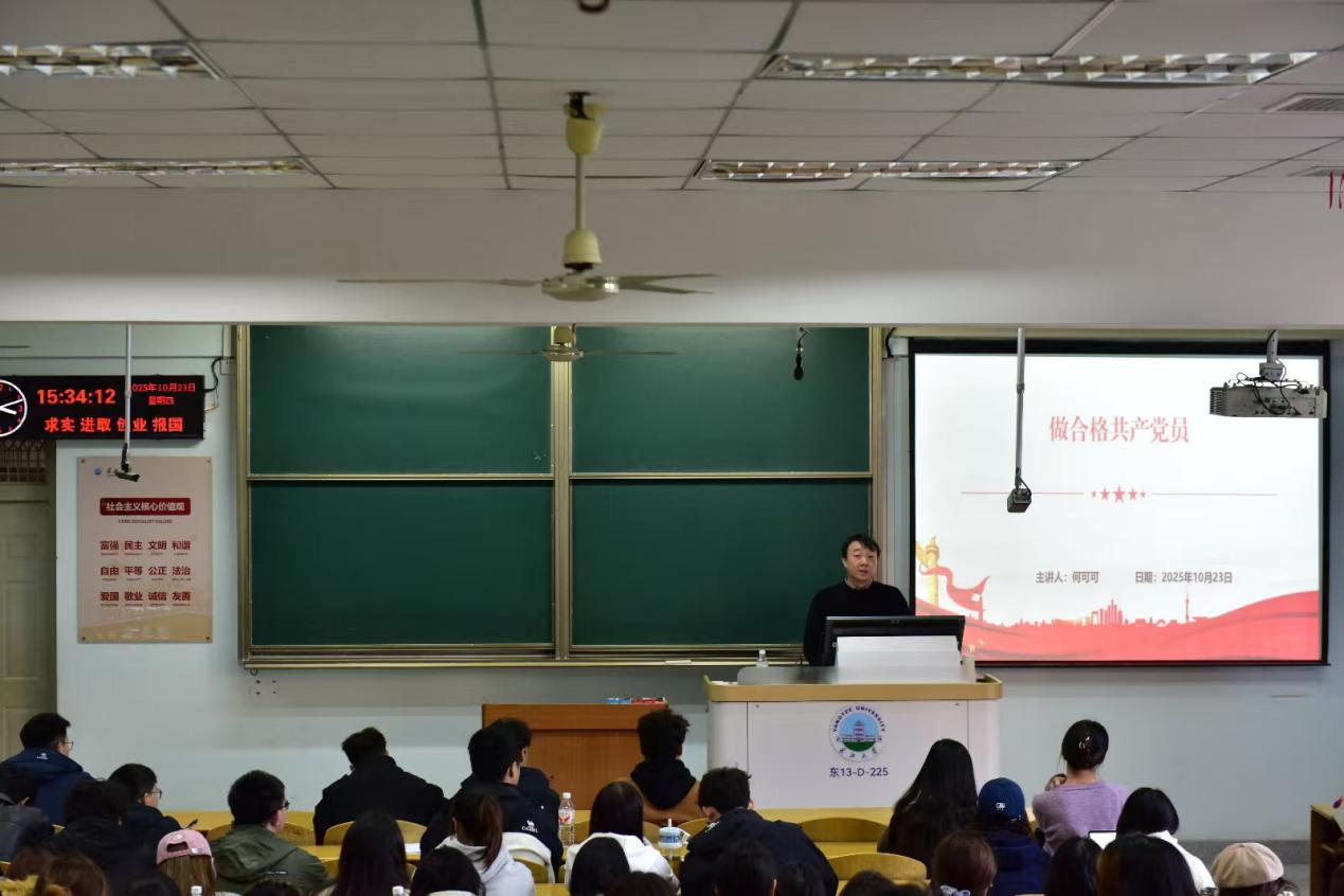 随后,何可可老师以“做合格共产党员”为主题进行第三讲授课。他系统回顾了从革命年代、建设时期到新时代合格党员标准的历史演进,重点阐述了新时代合格共产党员应具备的“四项核心本领”,并针对学员们在思想、学习、生活中遇到的实际问题,提出了具体可行的实践路径。何可可老师强调,“合格共产党员”不是荣誉称号,也不是“毕业证书”,而是需要终身践行的奋斗目标。他建议学员们课后认真研读《毛泽东选集》等经典著作,从中汲取智慧和力量,并引导大家制定在校期间的“合格党员成长行动计划”,将理论学习转化为实际行动。