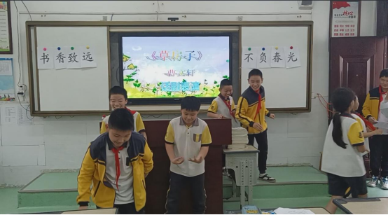 五年级课堂主要分为“书”字设计展览、读书经验分享、好书片段分享、以诗作画&话剧表演四个环节。其中,在最后的以诗作画和话剧表演环节中,主讲人陆宇利用自己制作的《题临安邸》诗配画视频,与同学们一起感悟古诗的意境美并通过简笔画表达出来,绘画结束后,15名同学的精彩话剧赢得了老师和同学们的欢笑与掌声。