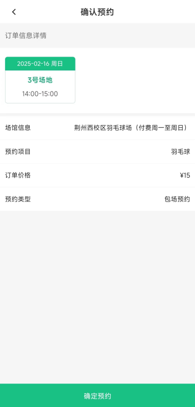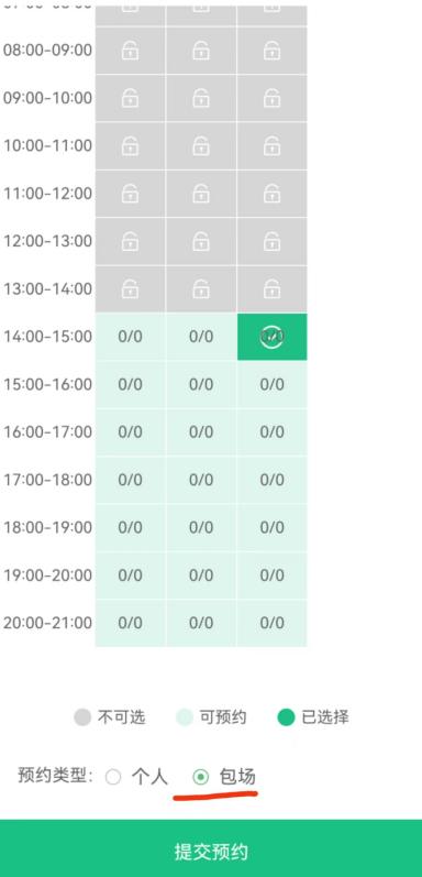 3.选择场地:选择好预约时间后,选择“包场”预约。点击确认前仔细核对预约的日期、时间、场地等内容是否准确无误。确认无误后,点击 “确预约” 选项预约完成后在预约场地开始时间前10分钟内达到场地并缴纳费用。