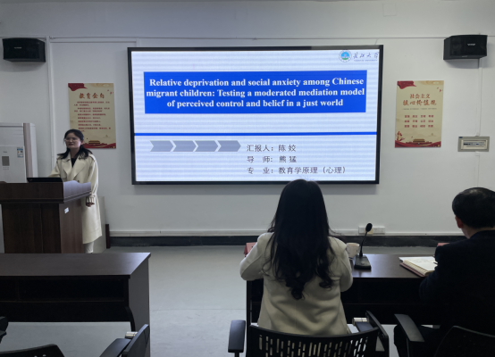 罗学敏汇报的主题为《创业领导力对大学生创业意向的影响》,指出创业警觉性和感知行为控制这两个中介变量起到的作用,构建了一个创业警觉性与感知行为控制关系的中介模型,模型拟合程度良好,研究结果说服力强;胡志琴针对相对剥夺感与大学生网络欺凌的关系展开全面透彻的思考,并提出道德推脱的中介作用与道德认同的调节作用,角度新颖,最后号召大家自觉抵制网络暴力,发人深思;陈思园汇报了大学生群体认同与主观幸福感:社会联结和心理融合的多重中介效应,为我们研究大学生认同与主观幸福感提供了新视角;陈姣作了题为《Relative deprivation and social anxiety among Chinese migrant children: Testing a moderated mediation model of perceived control and belief in a just world》的英文汇报,研究采用问卷方式,对流动儿童的相对剥夺感与社会焦虑开展了深入调查,并对控制感知与公平世界信念的调节中介模型进行检验,数据分析简明合理,让我们对流动儿童的相对剥夺感与社会焦虑的形成原因有了更深入的了解。