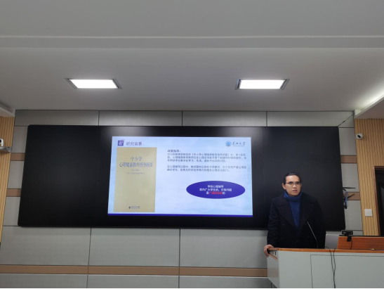 张浩毅汇报的主题为《焦点解决短期疗法在初中生心理咨询中的应用研究》,他以初中生心理健康教育的实践需要为出发点,探究焦点短期治疗(SFBT)是否对于初中生个体心理咨询有效,以及哪些SFBT技术有效。他首先发放《DASS-21抑郁-焦虑-压力量表》、《暴力暴露量表》、《学校联结量表》和《网络成瘾量表》问卷对荆州市某中学初一学生进行调查,将符合SFBT咨询要求且自愿参与的初中生作为被试,对其进行SFBT个体心理咨询(征得被试对咨询过程记录和录音的同意),并通过考察咨询前、咨询后以及半学期后被试的问题行为,来确定SFBT个体心理咨询对初中生是否有效。然后对咨询记录的材料进行编码和分析,关注被试的转变是由哪些SFBT技术导致的。老师点评环节,首先是郑老师对研究中前测后测以及测量的时间间隔提出建议。其次是冯老师,她先肯定了本研究的意义,后在此基础上提出对照组的实验处理的建议。