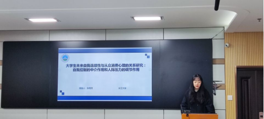 张竞月汇报主题为《大学生未来自我连续性与从众消费心理的关系研究》,她通过问卷调查对452名大学生的未来自我连续性和理性从众消费心理之间的关系进行了研究,并分析自我控制的中介作用和人际压力在中介后半段的调节作用。研究结果发现,未来自我连续性高的大学生,自我控制水平更高,更容易产生理性的从众消费,自我控制的中介作用显著。这可能是因为未来自我连续性越高,自我控制能力越强,相对于短期利益,更可能进行有利于长期发展的决策(如理性的从众消费)。但人际冲突压力在自我控制对从众消费影响中的调节作用不显著,这还需要进一步的思考。老师点评环节,首先是郑老师就研究设计中自我连续性和从众消费带来的影响进行了探讨。其次是冯老师对研究的自变量之间的关系提出了建议。