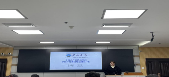 首先是陈露露同学,她就“中国共产党执政期间学校体育课程思政建设分析”做了专题报告。从体育与课程思政和不同时期的体育与课程思政两个部分展开,她提出体育教学理念的转变定义,并对课程思政的提出进行详细的介绍。