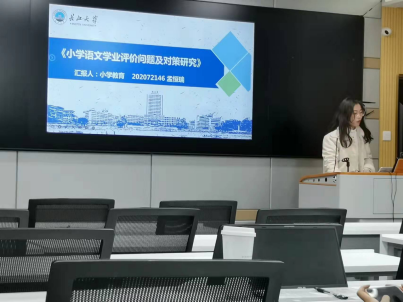 然后是孟恒瑞同学,她就“小学语文专业评价问题及对策研究”做了专题汇报。孟恒瑞同学从研究目的和研究意义入手,之后对学业评价、小学语文学业评价做了概念界定,对存在的问题和问题存在的原因进行了分析,最后从四个方面提出了改进策略。