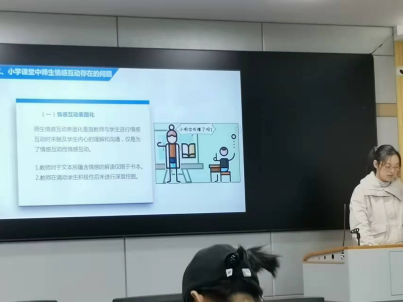 接着是刘静同学,她就“小学课堂中师生情感互动的优化策略”做了专题报告。刘静同学主要从师生情感互动的含义、小学课堂中师生情感互动存在的问题、小学课堂中师生情感互动问题的原因分析、小学课堂中师生情感互动的优化策略四个方面展开论述,然后进行总结与分析。