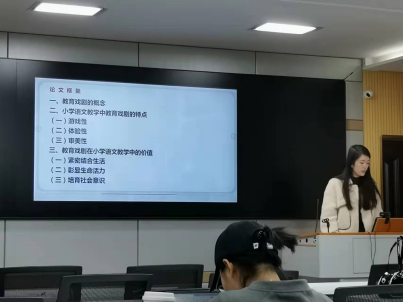 接着是原皓琦同学,她就“论教育戏剧在小学语文教学中的价值”做了专题报告。主要从教育戏剧的概念入手,分别分析了小学语文教学中教育戏剧的特点,以及教育戏剧在小学语文教学中的价值,条理清楚、分析得当,让同学对教育戏剧有了更深的理解。
