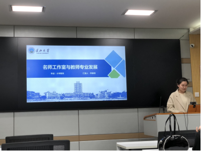 其次是李章博同学,她就“名师工作室与教师专业发展”做了专题报告。同学从概念界定入手,先对名师和名师工作室的概念进行了界定,之后从教师专业发展的有效形式进行了分析。最后分析了论文的研究局限。