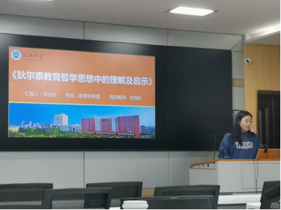 最后是邓玉玲同学,她的汇报主题为狄尔泰教育哲学思想中的理想及启示,她从选题背景、研究方法及过程、研究的主要内容、归纳小结几个方面来进行汇报。