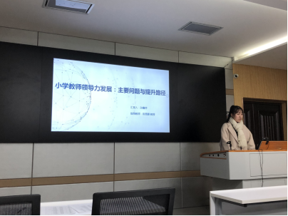 首先是孙鑫芳同学,她就“小学教师领导力发展:主要问题与提升路径”做了专题报告。孙鑫芳同学从研究目的入手,分析了小学教师领导力发展出现的问题及出现问题的原因,之后从四个方面提出小学教师领导力的提升路径,最后汇报了研究结果和研究不足。