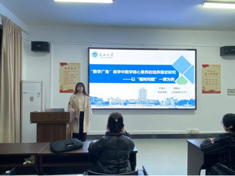 接着是小学教育学专业的邵艳红同学,她就“以‘数学广角’教学中数学核心素养的培养现状研究”做了专题报告。报告以“数学广角”教学中数学核心素养培养的必要性、“数学广角”教学中数学核心素养的培养现状、针对性地提出“数学广角”教学中数学核心素养的培养策略三部分作为研究内容,以“植树问题”一课为例力图提出针对性的可实施的问题及解决对策。
