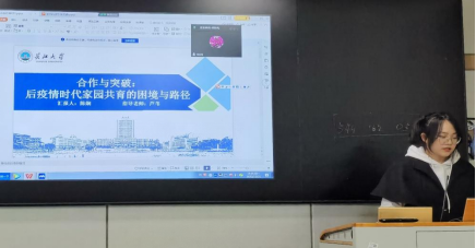 陈娴同学就“合作与突破”后疫情时代家园共育的困境与路径“进行了专题汇报,她从当今疫情的时代背景下提出了这一研究课题,然后从研究意义、研究方法、研究内容和研究局限等方面论述了这一课题,阐述了疫情时代背景下家园共育的现状和问题,得到了老师的认可和支持。