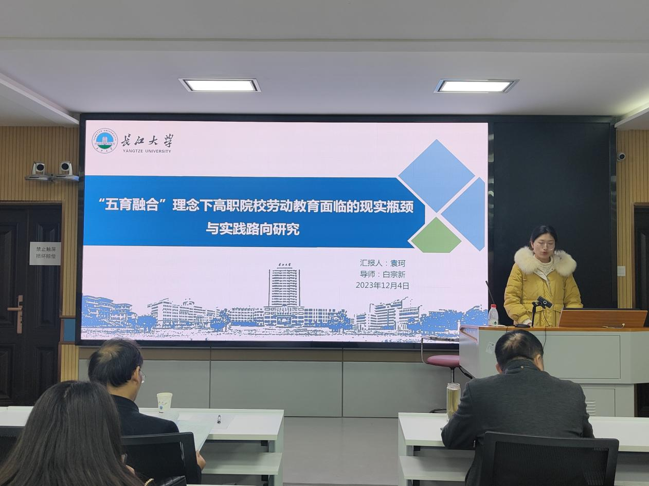本次活动共有5位主讲,即2022级教育学专业高等教育学方向的袁珂、刘燕霖、尤宇航、谭德平、姚慧爽,依次就其研究作了汇报。袁珂汇报的主题为《“五育融合”理念下高职院校劳动教育面临的现实瓶颈与实践路向研究》。她指出劳动教育是“五育”的重要组成部分和有效载体,当前劳动教育面临发展瓶颈,应当从把握劳动教育“外需内促”的发展规律、创新“五育融合”特色劳动教育体系、构建劳动教育“家校社企”协同育人平台、提升多元化劳动教育支撑保障能力四个方面探索具有职教特色的劳动教育实施路向。