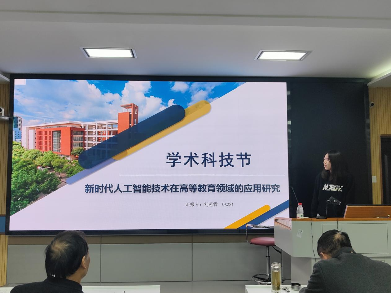 刘燕霖汇报的题目是《新时代人工智能技术在教育领域的应用》。她就人工智能在教育中的运用,从学习者视角、教师专业化、智能化教学管理、多维交互方式以及未来发展的角度展开讨论,最后指出人工智能在教育中面临的挑战和限制,并对未来人工智能在教育领域的发展进行了展望。