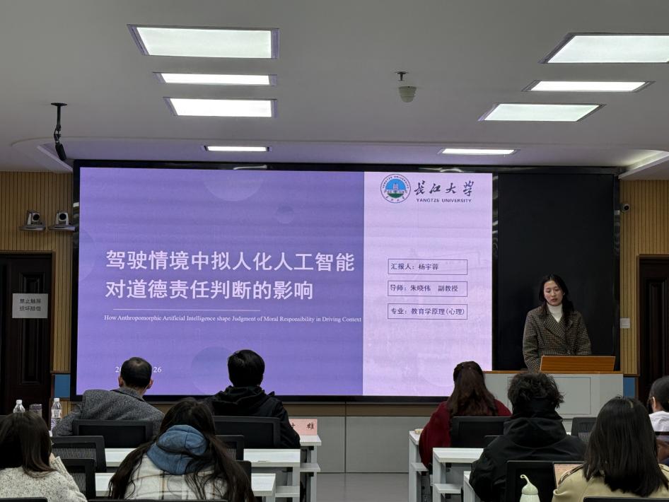 本次活动的五位主讲,即2023级教育学原理专业心理学方向的蒲俊伟、刘嘉玲、杨宇蓉、张艳君、秦可依次就其研究作了汇报。