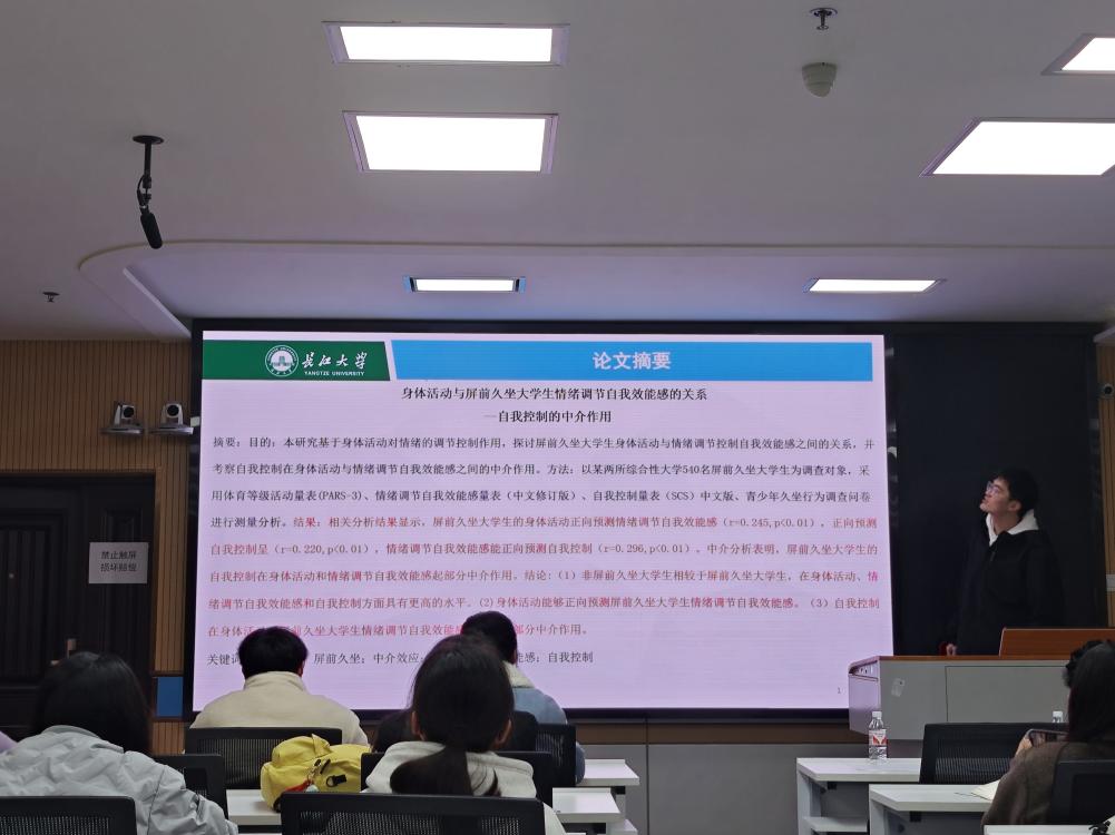 王志文汇报的主题是《身体活动与屏前久坐大学生情绪调节自我效能感的关系-自我控制的中介作用》,他以两所综合性大学540名屏前久坐大学生为调查对象,采用体育等级活动量表(PARS-3)、情绪调节自我效能感量表(中文修订版)、自我控制量表(SCS)中文版、青少年久坐行为调查问卷进行测量分析,深入探讨了屏前久坐大学生身体活动与情绪调节控制自我效能感之间的相关关系。