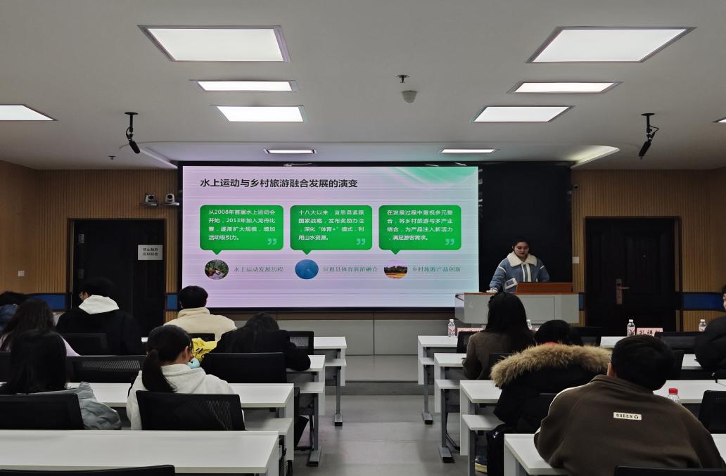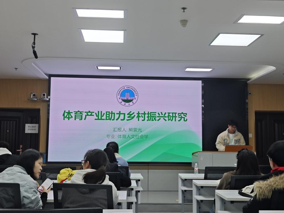 随后,熊紫光汇报的主题是《体育产业助力乡村振兴研究》,他介绍了其选题背景,即基于乡村振兴战略的提出以及体育产业的潜力与作用,之后分析了体育旅游、体育赛事、体育教育与培训等相关领域的未来发展,并说明了体育产业在乡村振兴中的经济效益和潜在价值,最后对体育产业在具体助力乡村振兴的实践过程中存在的问题及原因进行了分析。