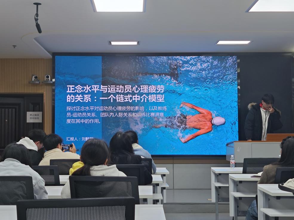 最后,刘懿樊汇报的主题是《正念水平与运动员心理疲劳的关系:一个链式中介模型》,他具体阐述了心理疲劳的定义与影响,说明了运动员心理疲劳会导致的后果,以及正念对于运动员的心理疲劳的作用和二者之间的相关性。
