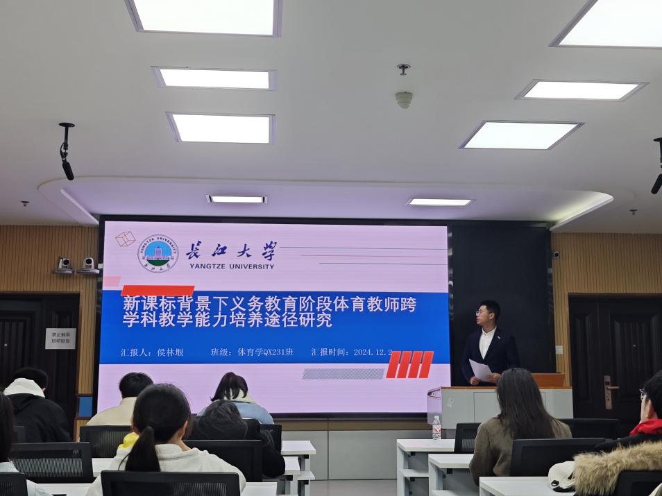 候林堰汇报的主题是《新课标背景下义务教育阶段体育教师跨学科教学能力培养途径研究》,他分别介绍了新课标背景下体育教师跨学科教学的概念与意义、价值意蕴、能力的构成要素以及能力培养的途径,让同学们了解了跨学科知识学习和延展对于体育学学科进一步发展的重要作用。