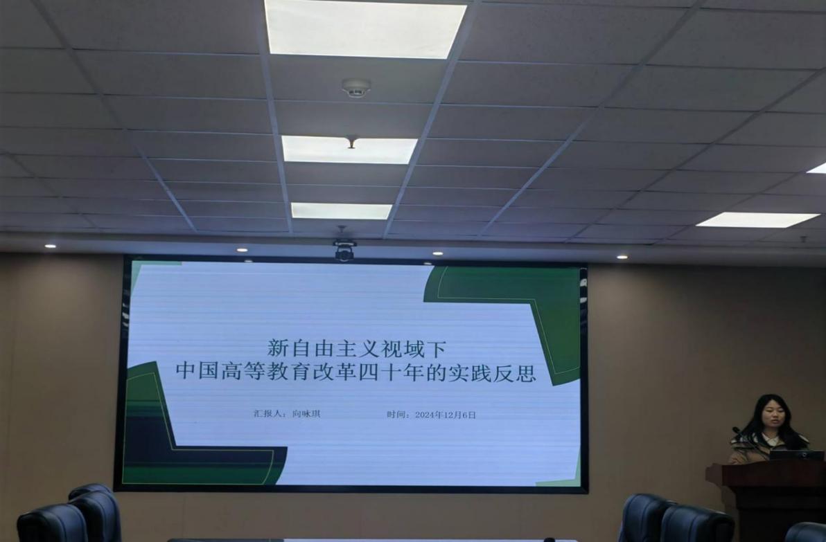 向咏琪汇报的主题是《新自由主义视域下中国高等教育改革四十年的实践反思》,从基本走向、实践困境、未来展望等方面对新自由主义下中国高等教育改革进行了详细的介绍。让同学们对中国高等教育有了更加清楚的认识和理解,对推动和促进高等教育发展和完善提供了更为系统的理论基础。