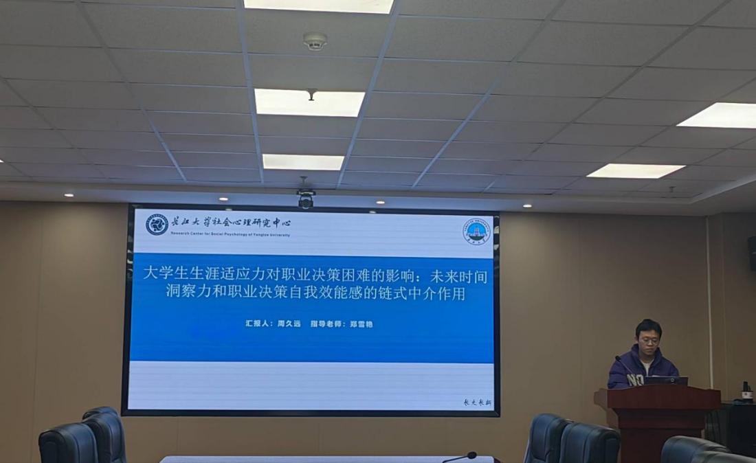 周久远分享的主题是《大学生生涯适应力对职业决策困难的影响:未来时间洞察力和职业决策自我效能感的链式中介作用》,具体分析了大学生职业生涯的初期面临严峻的“就业挑战”这一现状,通过问卷调查法进行系统研究,论证了生涯适应的提升有助于减少职业决策中的困难,对同学们就业意识的提高具有重要的理论和实践意义。