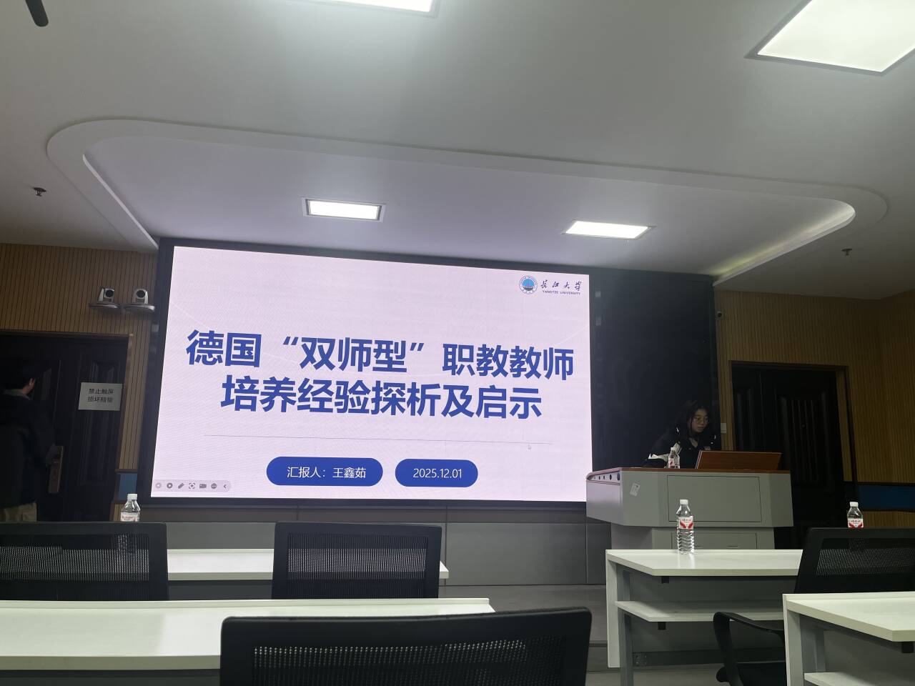 王鑫茹汇报的主题是《德国“双师型”职教教师培养经验探析及启示》,她首先阐明德国“双师型”职教教师培养的经验,集中表现在重视职教的教师教育理念、严格的教师准入制度、系统的教师培训体系、健全的师资考评体系、完备的外部保障体系等方面。接着她主张我国可从更新职教教师培养观念、严控“双师型”教师选聘关口、健全教师培训体系、完善教师考评机制、强化外部制度保障等方面进行借鉴改进,从而加快构建我国高质量“双师型”职教教师队伍。